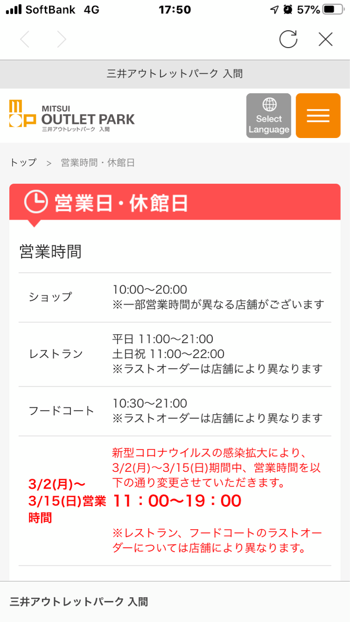 スポンサーリンク 三井アウトレットパーク入間3/2から3/15まで新型コロナウイルス感染拡大のため営業時間変更とのこと日々の生活TwitterFacebookはてブPocketLINEコピー 2020.09.20 2020.02.29三井アウトレットパーク入間が3/2から3/15まで新型コロナウイルス感染拡大のため営業時間変更とのこと営業時間は11:00から19:00だそうです。